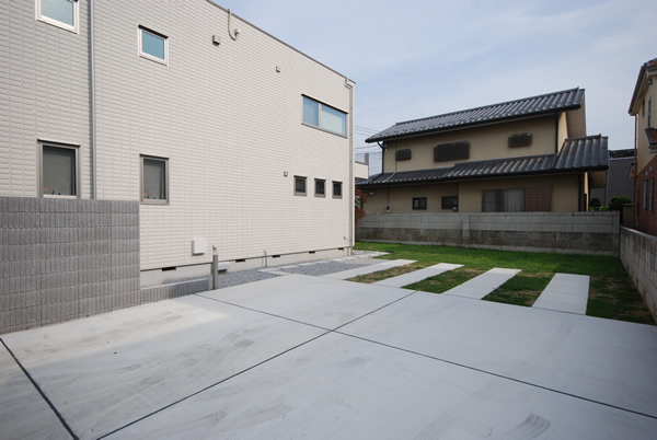 マテリアル インターロッキング・タイル・塗壁・芝・跳ね上げ門扉・門扉・カーポート